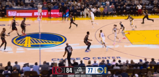 首节比赛中段,库里替补出场,他的登场获得了来自主场球迷疯狂的欢呼。他很快给队友送出助攻,随后连续投篮偏出。之后一个回合中,库里迎着杜兰特超远三分拆炸弹,命中复出后首球,这个进球也彻底点燃了主场的氛围。首节比赛,库里拿到3分1助攻。